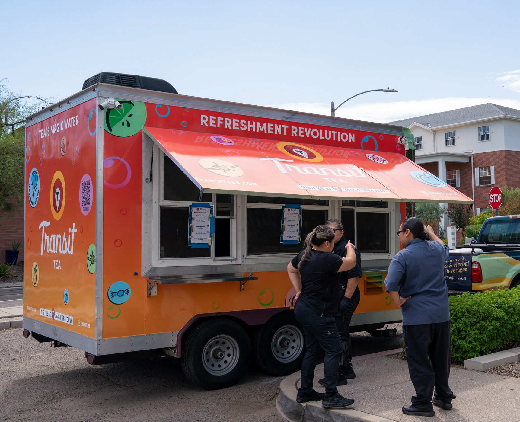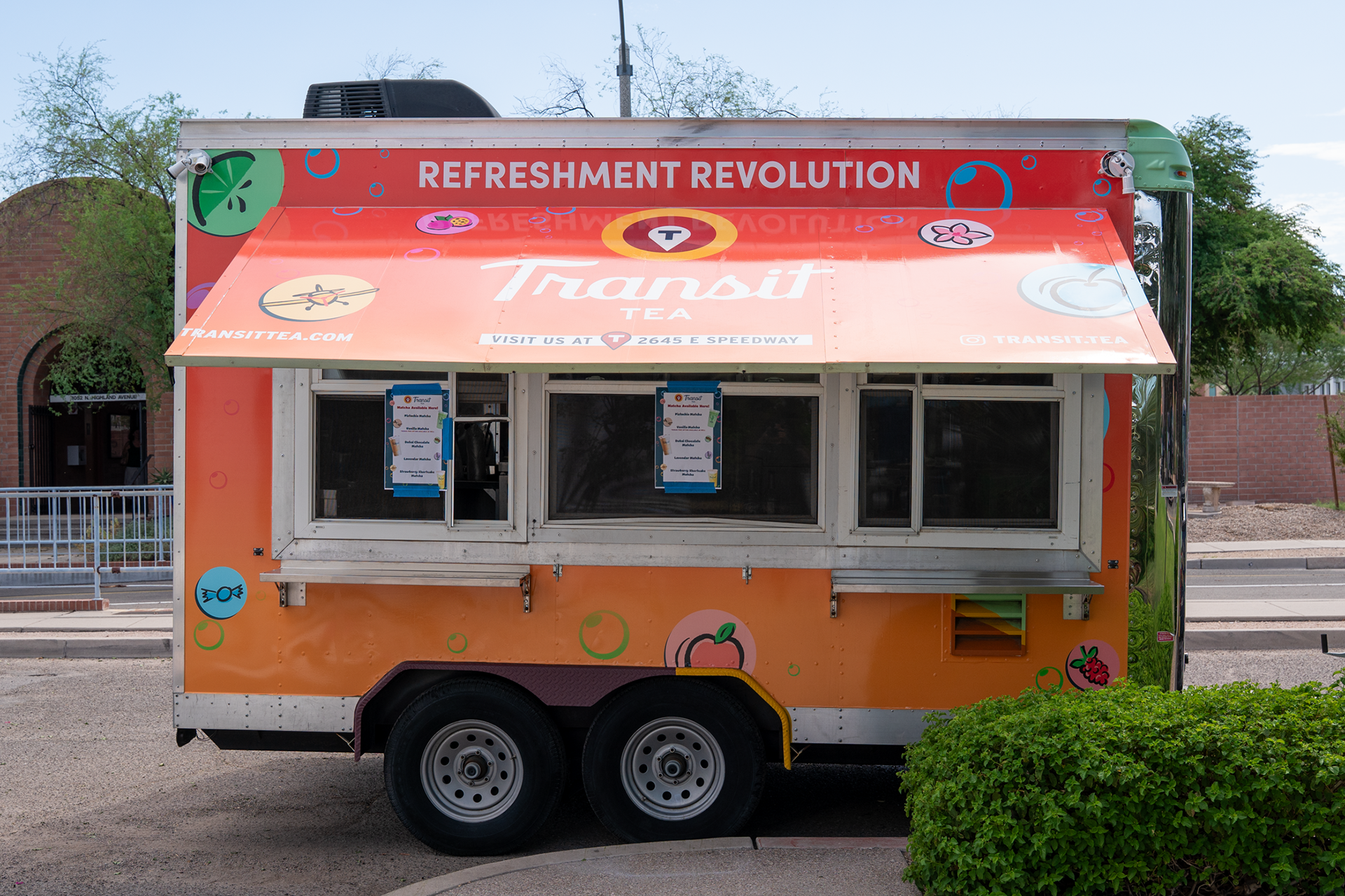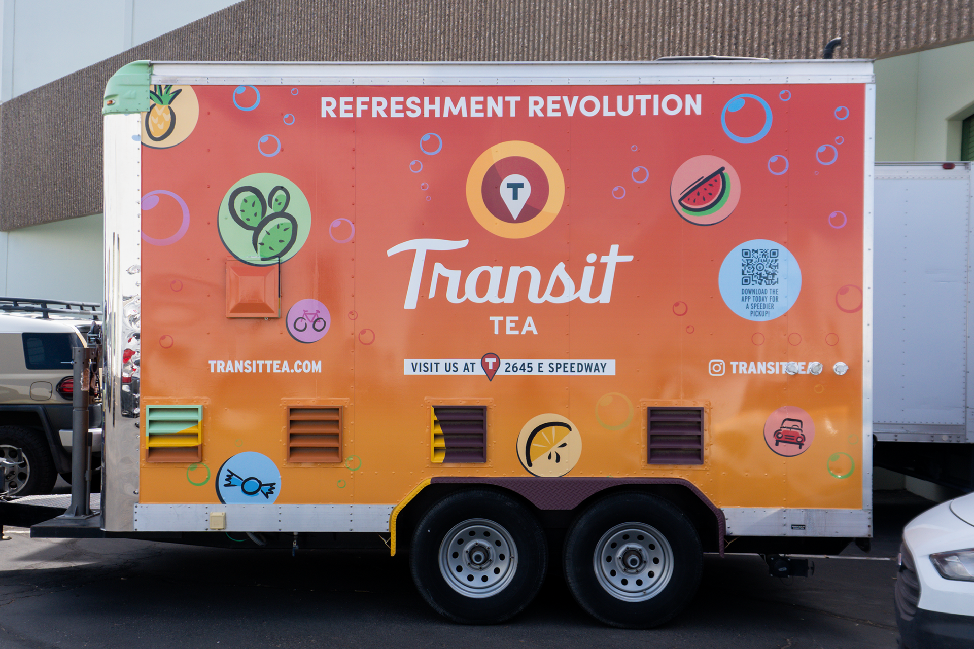 I was tasked with designing the wrap for an exciting new venture for Transit Tea which was their mobile trailer. If you've driven by the Transit Tea shop on Speedway Blvd you cannot miss the colorful building with bubbly fruits adorned on it. The idea for the trailer was to take what was already successful, but grab your attention on the go. I opted for a sunset ombré color scheme and use the bubble icons to drive home the Transit branding. I also pitched the "Refreshment Revolution" tagline as Transit wanted to make Tucsonan's aware of their unique offerings. The final wrap is something really beautiful and easy to notice when you're out and about which made this design a success.