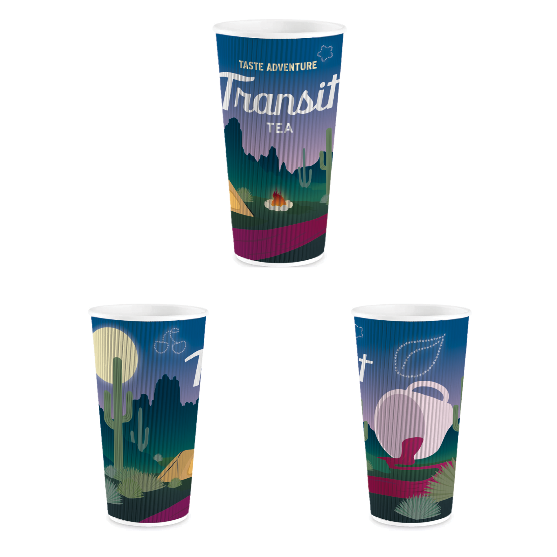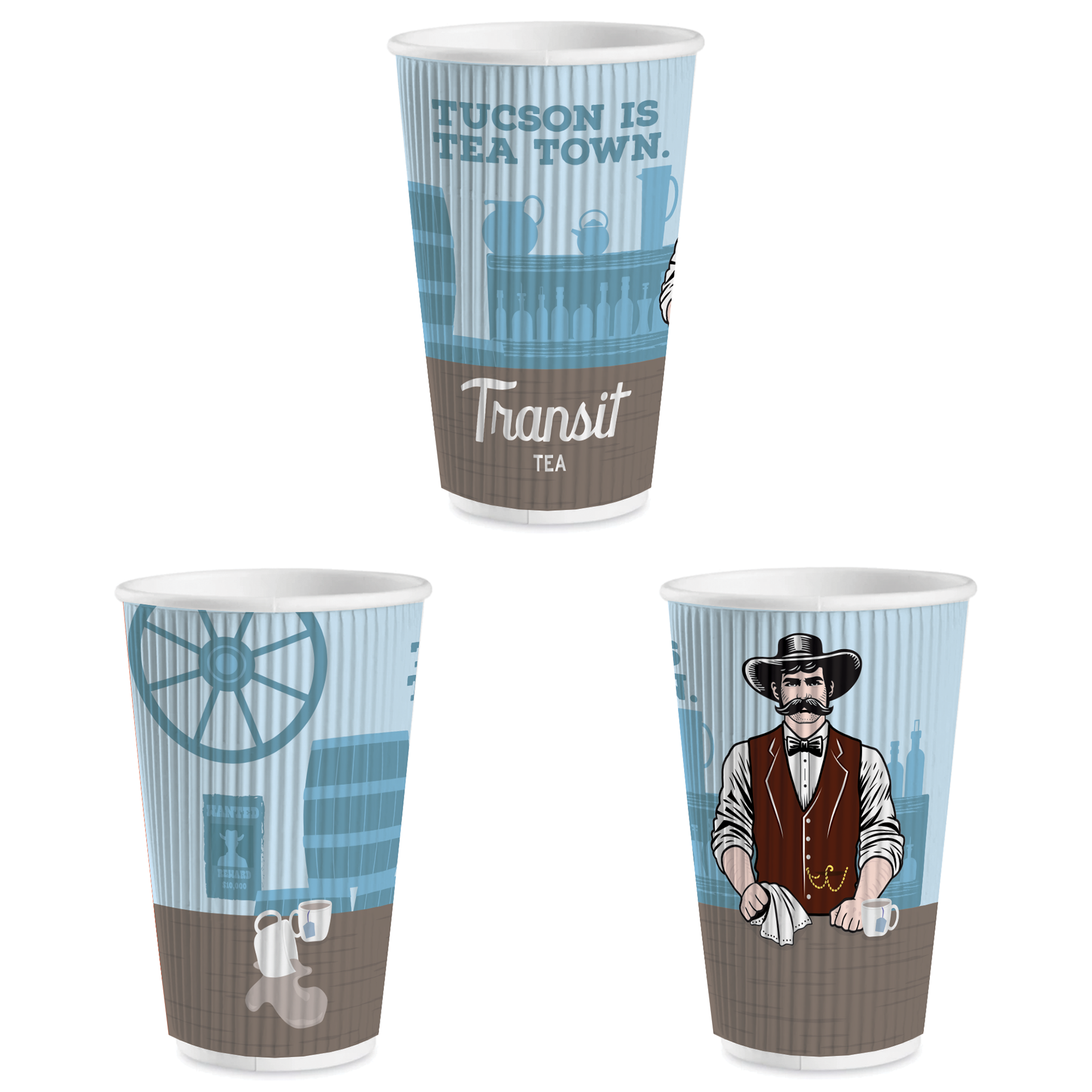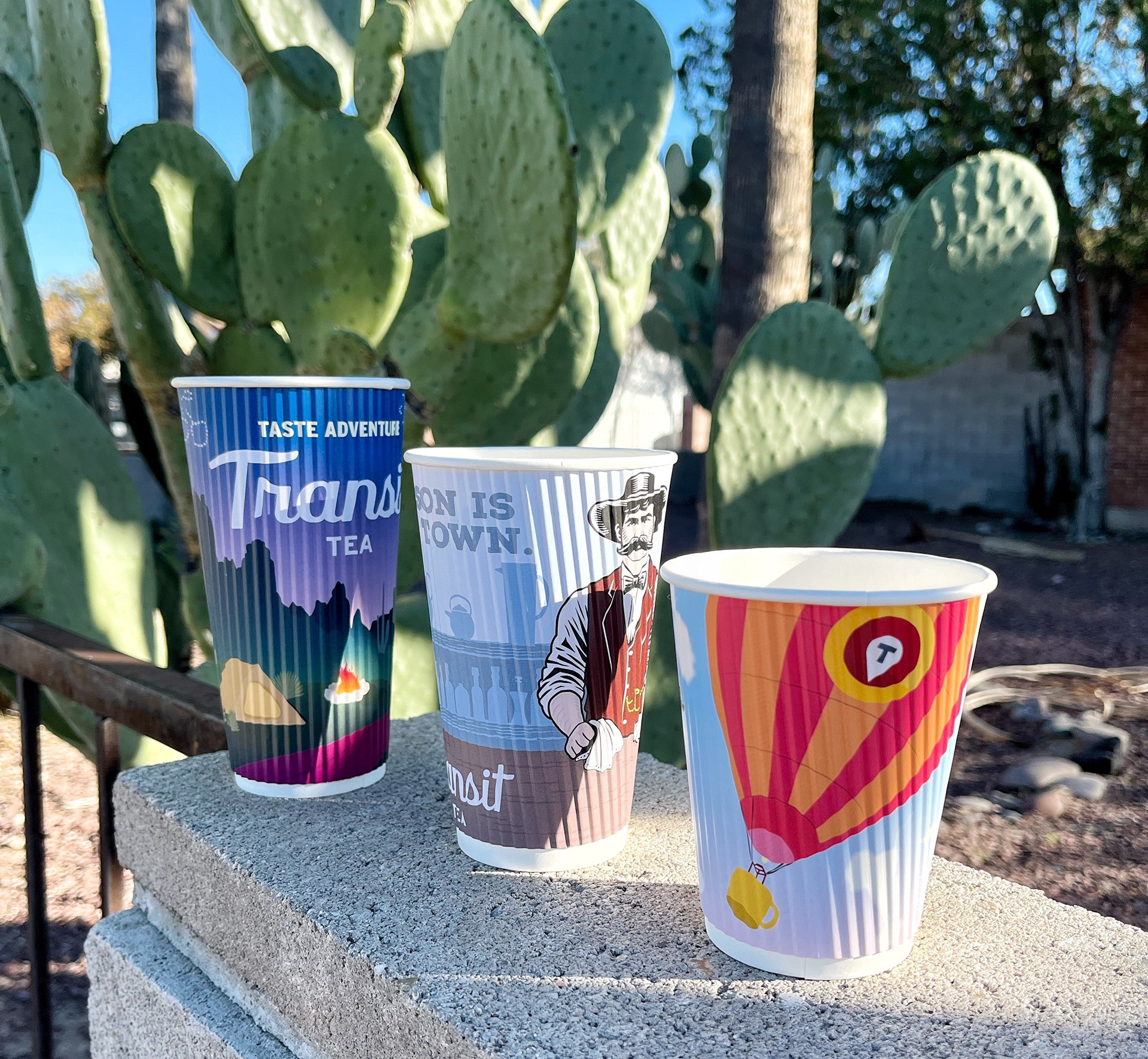 This is a lineup of cups for Transit Tea at the end of 2025. There is a hot air balloon tea mug design, a Tucson is Tea Town Cowboy Cup, and a spilled tea camping cup. Each size has a different design and the idea was to bring Tucson lifestyle and Transit's identity together to tell a story. The cups are lively, colorful and showcase the vibrance of Tucson culture and Transit Tea's explorative branding.