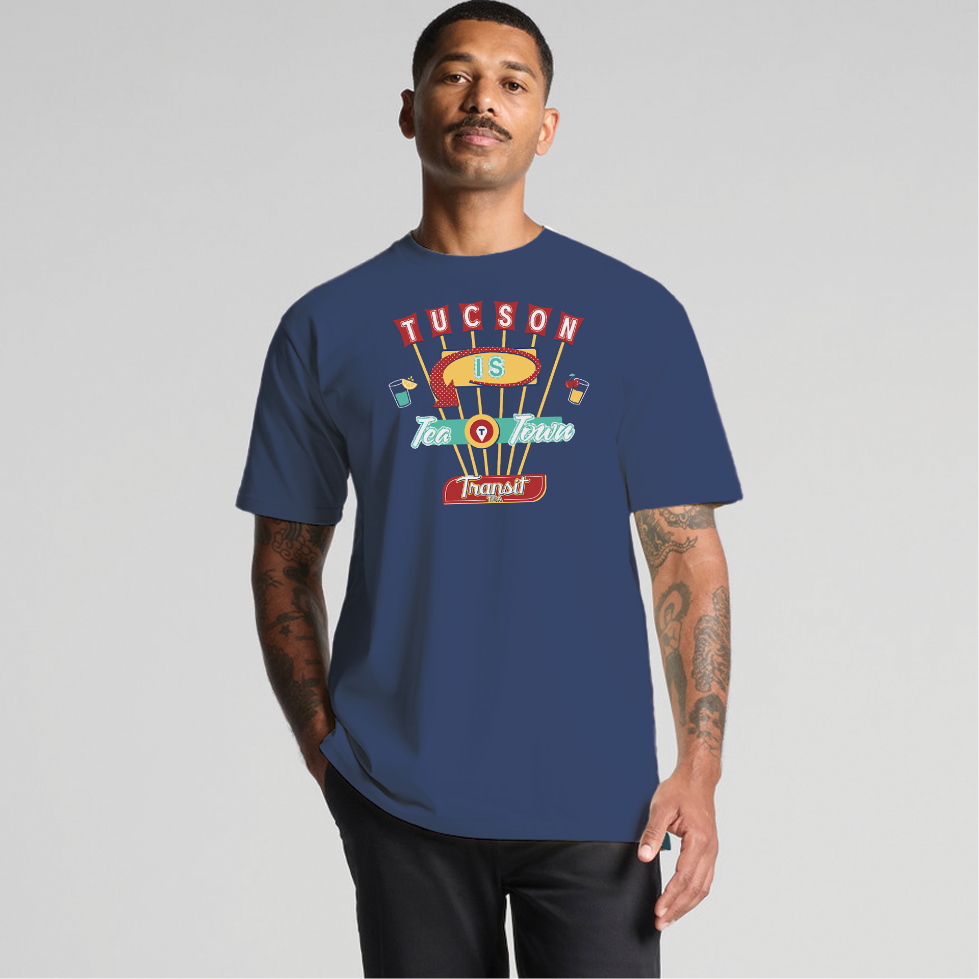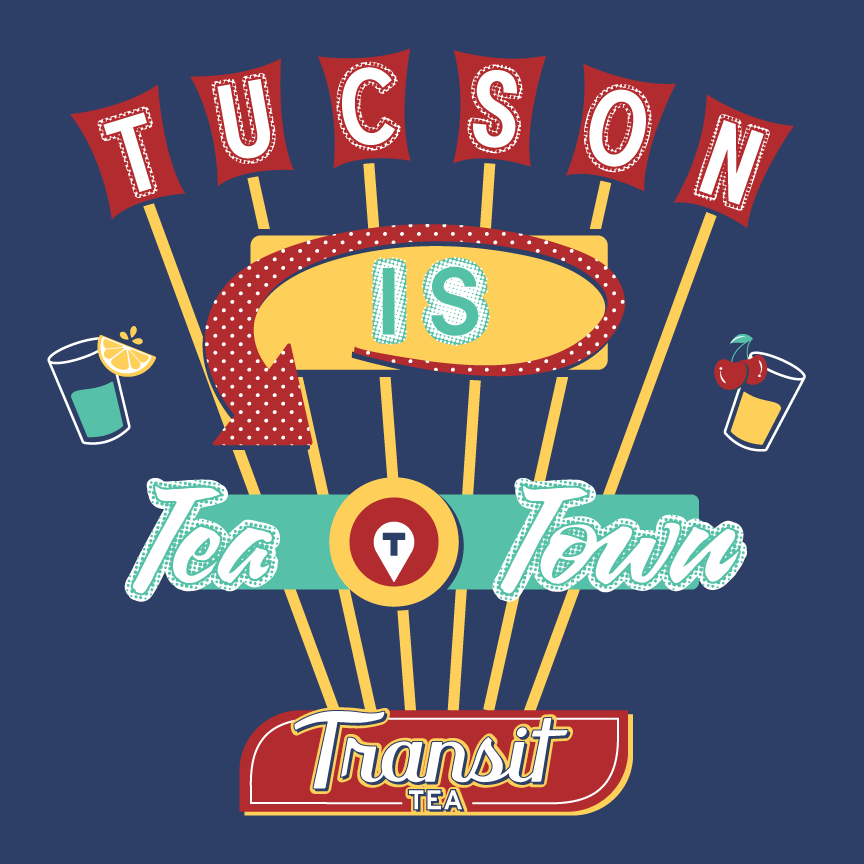 I was tasked with designing a t-shirt for Transit Tea that had a retro neon sign motif. I brainstormed many iconic signs throughout the town, but the old Tucson Inn sign on Drachman Street called to me. Transit Tea wanted to push the "Tucson Is Tea Town" tagline for this shirt which is a play on the T-Town nickname for Tucson. The final product is mocked up on a model wearing the shirt and has a cheeky, slick look to it. The shirt design was made in Adobe Illustrator and then mocked up in Adobe Photoshop.